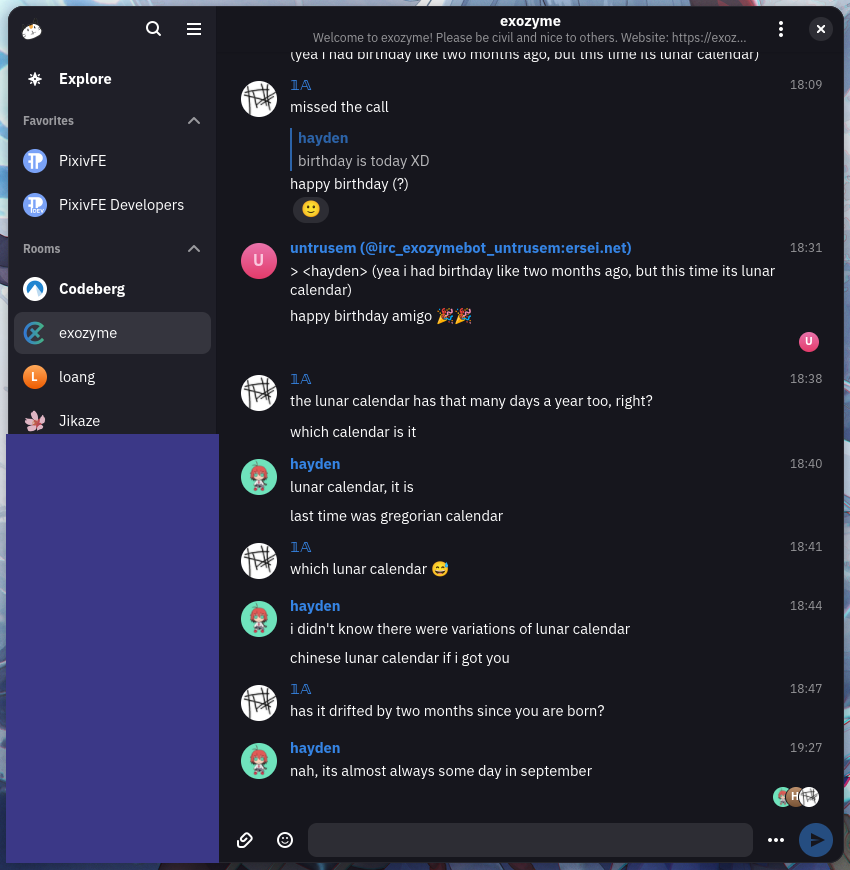 I also use Neochat, which is a native client for Linux desktops developed by KDE, but unfortunately it is buggy on my machine, so I preferred not to use it.