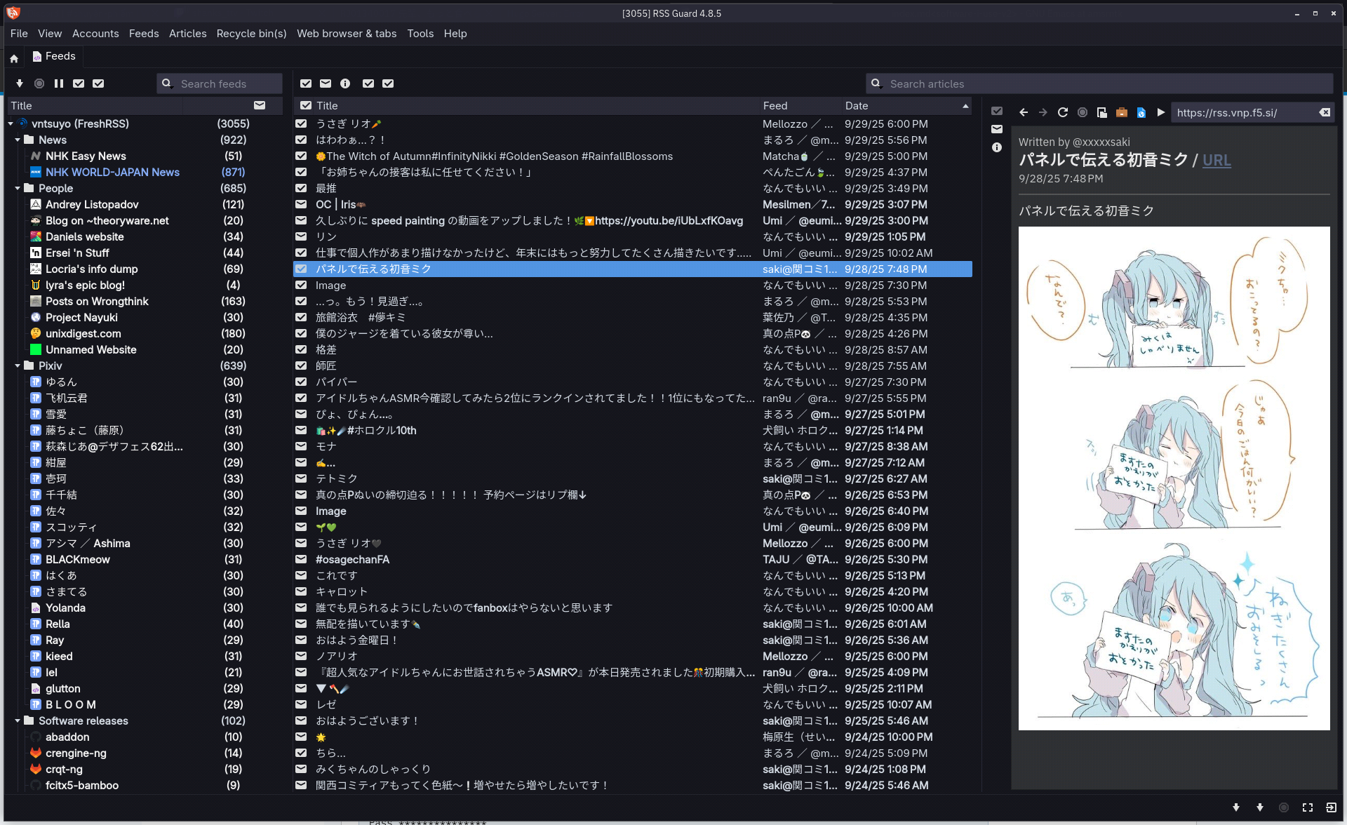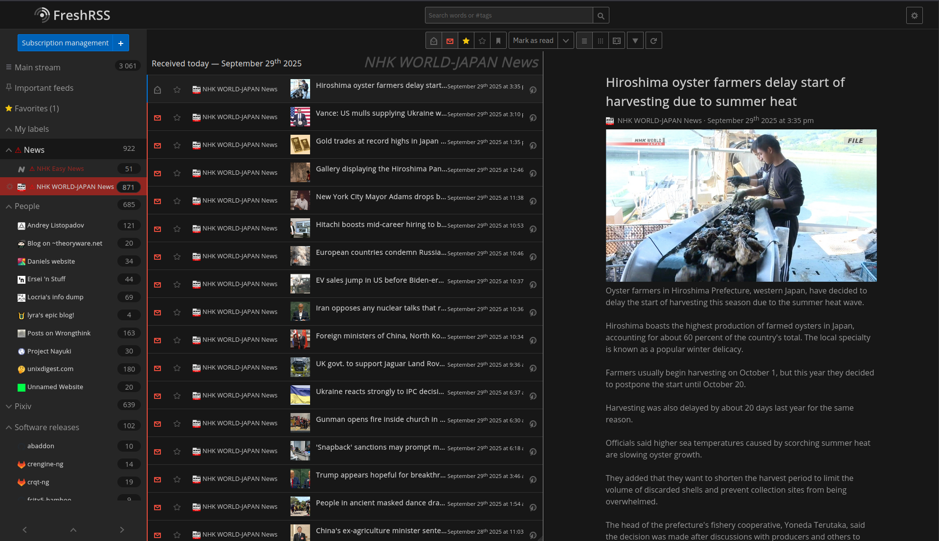 FreshRSS is a featureful and self-hostable RSS/news/feed aggrerator. It allows users to manage and organize feeds efficiently and supports multiple API schemes -> RSS readers. There are a lot public instances available to use, allowing people to easily have their subscriptions accessible everywhere.