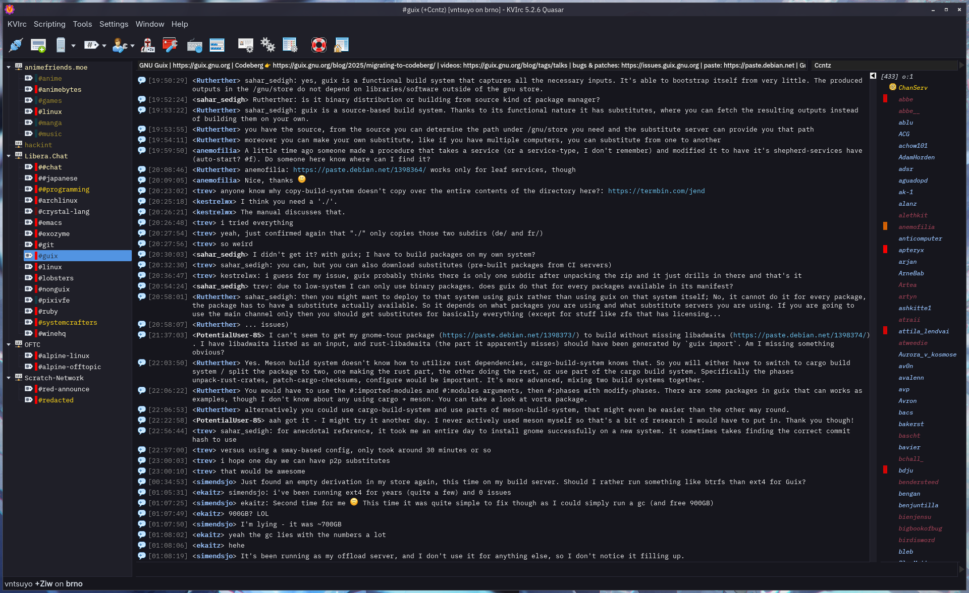 KVIrc is a Qt application for the IRC protocol. It is a great alternative to Hexchat for people who are seeking for a featureful GUI client. Works fine with bouncers.